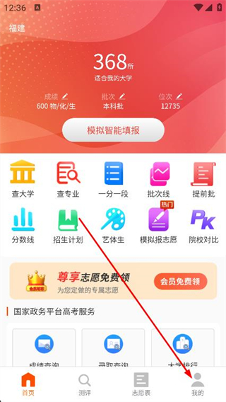 1、打開(kāi)高考志愿之家,點(diǎn)擊底部導(dǎo)航欄中我的選項(xiàng)。