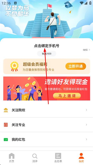 2、在我的頁(yè)面中,點(diǎn)擊上方的點(diǎn)擊綁定手機(jī)號(hào)選項(xiàng)。