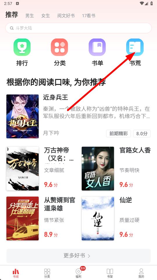 1、打開追書神器APP,進(jìn)入主界面中的書城頁面,點(diǎn)擊上方導(dǎo)航欄里的書荒選項(xiàng)。