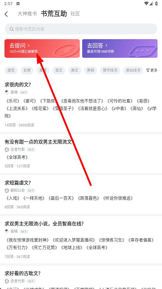 3、在書荒互助界面,點(diǎn)擊去提問按鈕,若處于游客狀態(tài),系統(tǒng)會提示登錄,按提示完成登錄后,即可進(jìn)行提問,尋求書荒相關(guān)問題的解答。