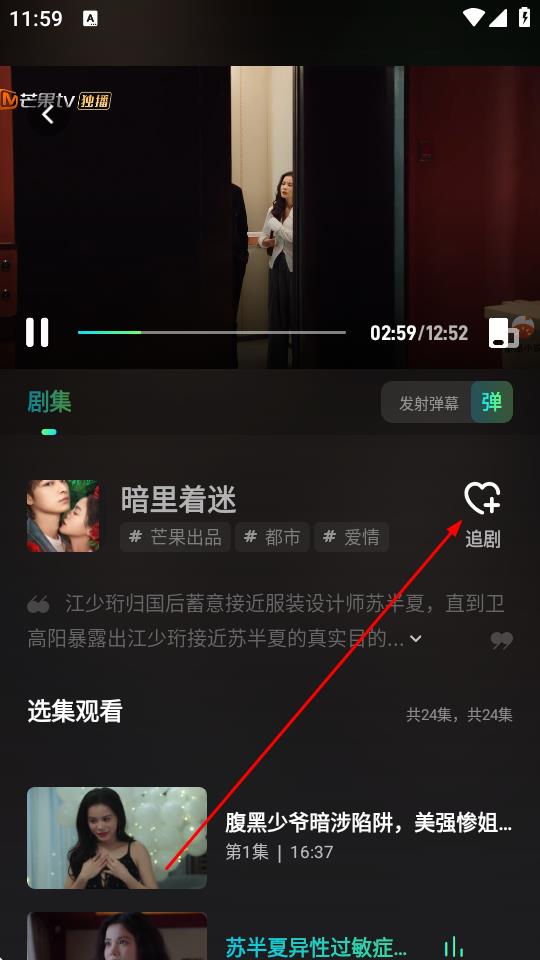 2、在劇集播放頁面中,點(diǎn)擊右側(cè)帶有+號的愛心圖標(biāo)。