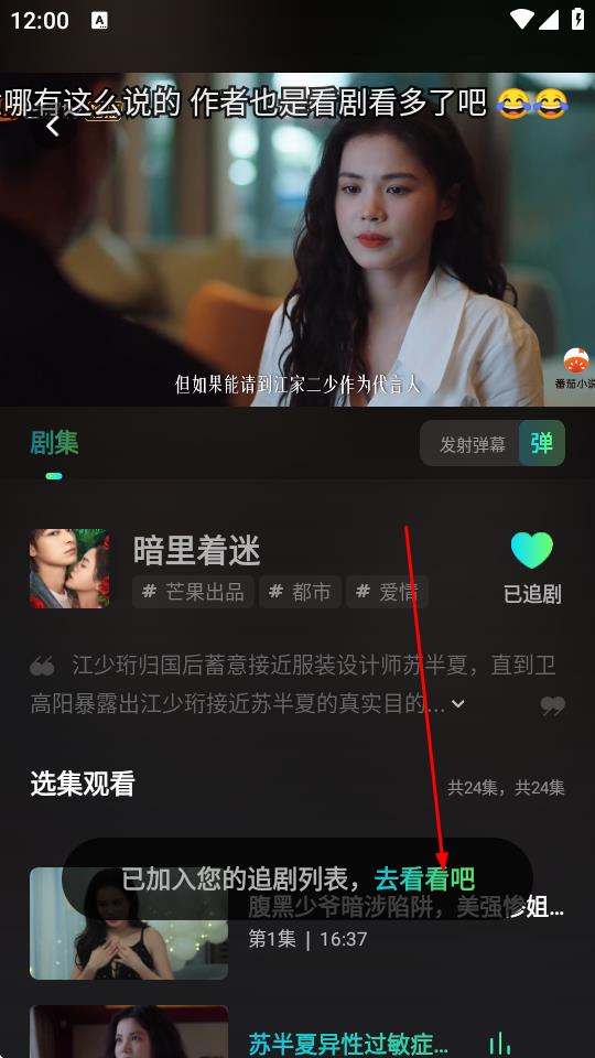 3、點(diǎn)擊后,愛心圖標(biāo)會變?yōu)閷?shí)心顏色,表示已成功加入追劇列表,彈出提示已加入您的追劇列表,去看看吧。