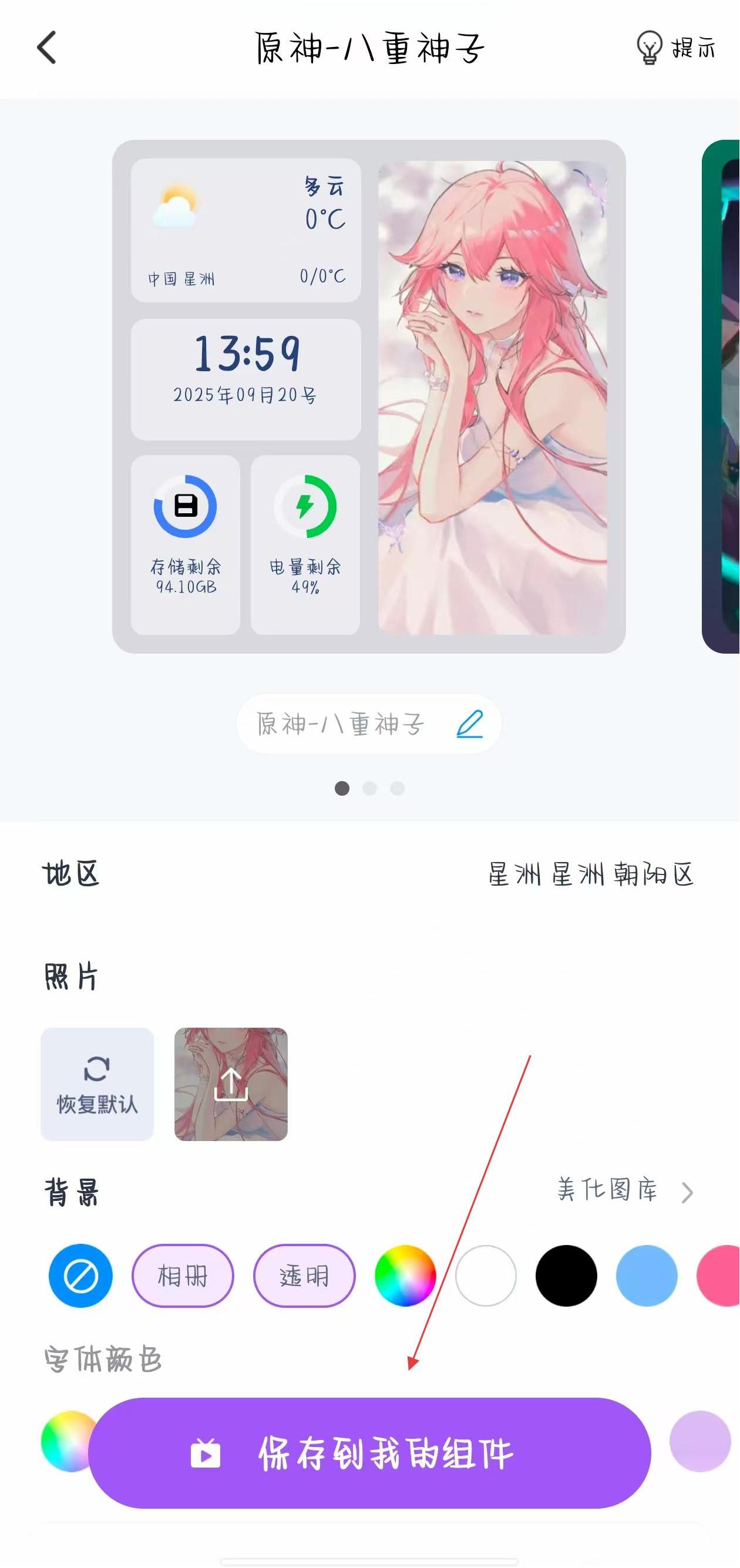 3、在小組件詳情設(shè)置界面,可對(duì)參數(shù)進(jìn)行調(diào)整,設(shè)置完成后點(diǎn)擊保存到我的組件按鈕。