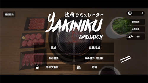 1、燒肉模擬器是一款日式烤肉模擬游戲,首先我們下載安裝好游戲,點(diǎn)擊進(jìn)入,會(huì)看見(jiàn)有挑戰(zhàn)/在線對(duì)戰(zhàn)/自由模式等不同的游戲模式,玩家可以根據(jù)自己的喜好選擇一個(gè)模式開(kāi)始游戲;