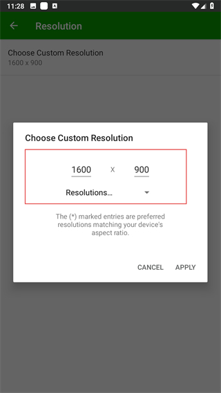5、在彈出的窗口中選擇或自定義分辨率,點擊APPLY即可。
