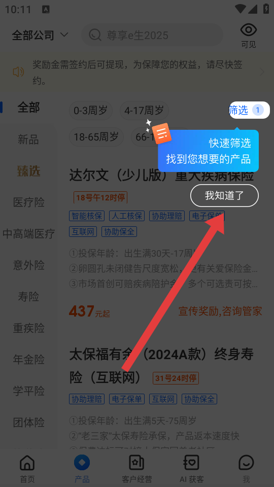 1、在產(chǎn)品瀏覽頁(yè),點(diǎn)擊彈窗的我知道了,關(guān)閉快速篩選的提示,然后繼續(xù)查看保險(xiǎn)產(chǎn)品信息。
