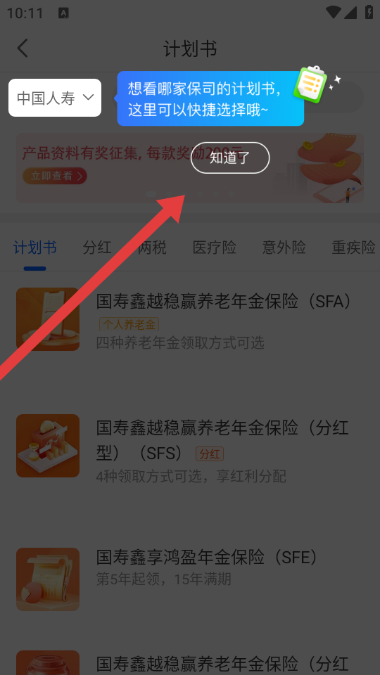2、進(jìn)入計(jì)劃書(shū)頁(yè)面,點(diǎn)擊彈窗的知道了,關(guān)閉保司選擇指引提示,便捷篩選保險(xiǎn)公司計(jì)劃書(shū)。