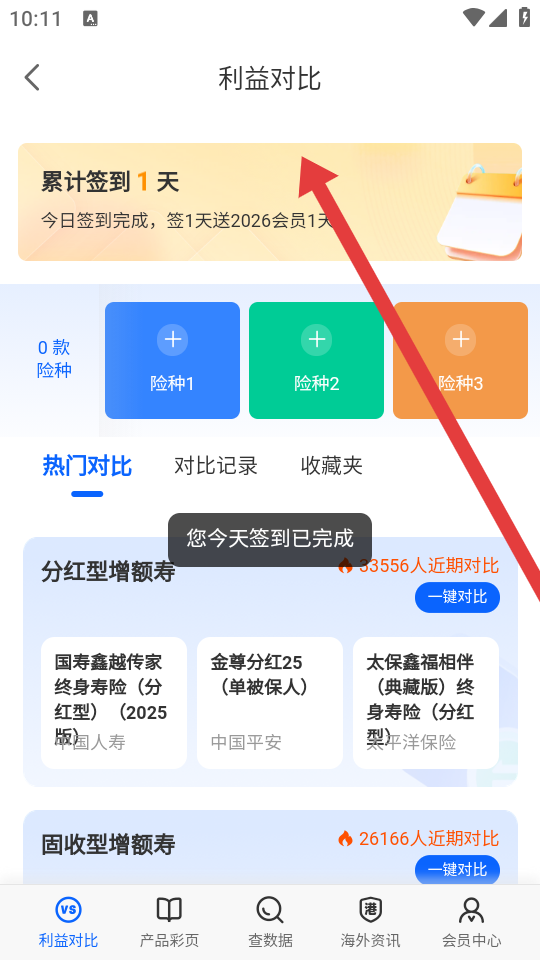 3、打開(kāi)利益對(duì)比頁(yè)面,查看累計(jì)簽到1天的信息,可添加險(xiǎn)種進(jìn)行利益對(duì)比,查看熱門對(duì)比數(shù)據(jù)。