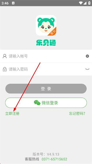 1、打開樂貝通app,在登錄界面,找到并點(diǎn)擊下方的立即注冊(cè)選項(xiàng)。
