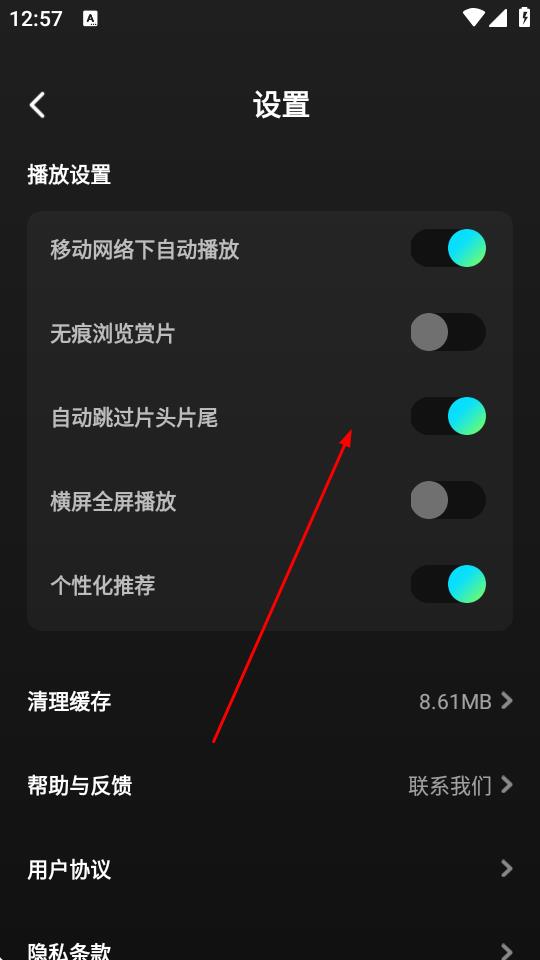 3、進入設置頁面后,找到自動跳過片頭片尾選項,并點擊開啟該功能,開啟后按鈕會呈現(xiàn)亮色。