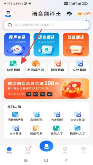 1、啟動(dòng)語言翻譯王APP,進(jìn)入到首頁內(nèi),點(diǎn)擊拍照翻譯的功能按鈕。
