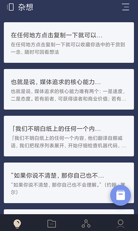 一款跨應(yīng)用靈感收集工具,以在其他App如瀏覽公眾號(hào)文章、網(wǎng)易云熱評(píng),豆瓣影評(píng),UC新聞……等場(chǎng)景下快速保存你的靈感。