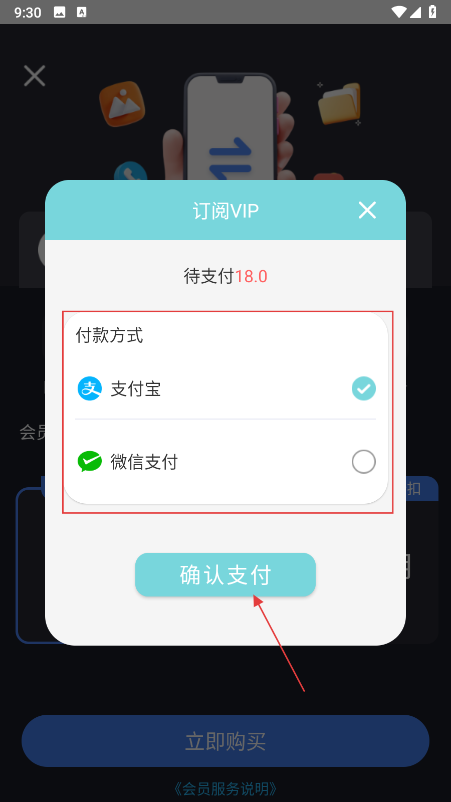 4、在支付方式選擇頁(yè)面,根據(jù)自身需求選擇支付寶或微信支付,選擇完成后點(diǎn)擊確認(rèn)支付按鈕。