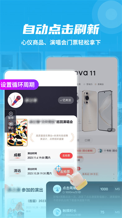 2、省去了用戶手動(dòng)進(jìn)行點(diǎn)擊的繁瑣操作,實(shí)現(xiàn)了自動(dòng)連點(diǎn)進(jìn)行搶票的操作;