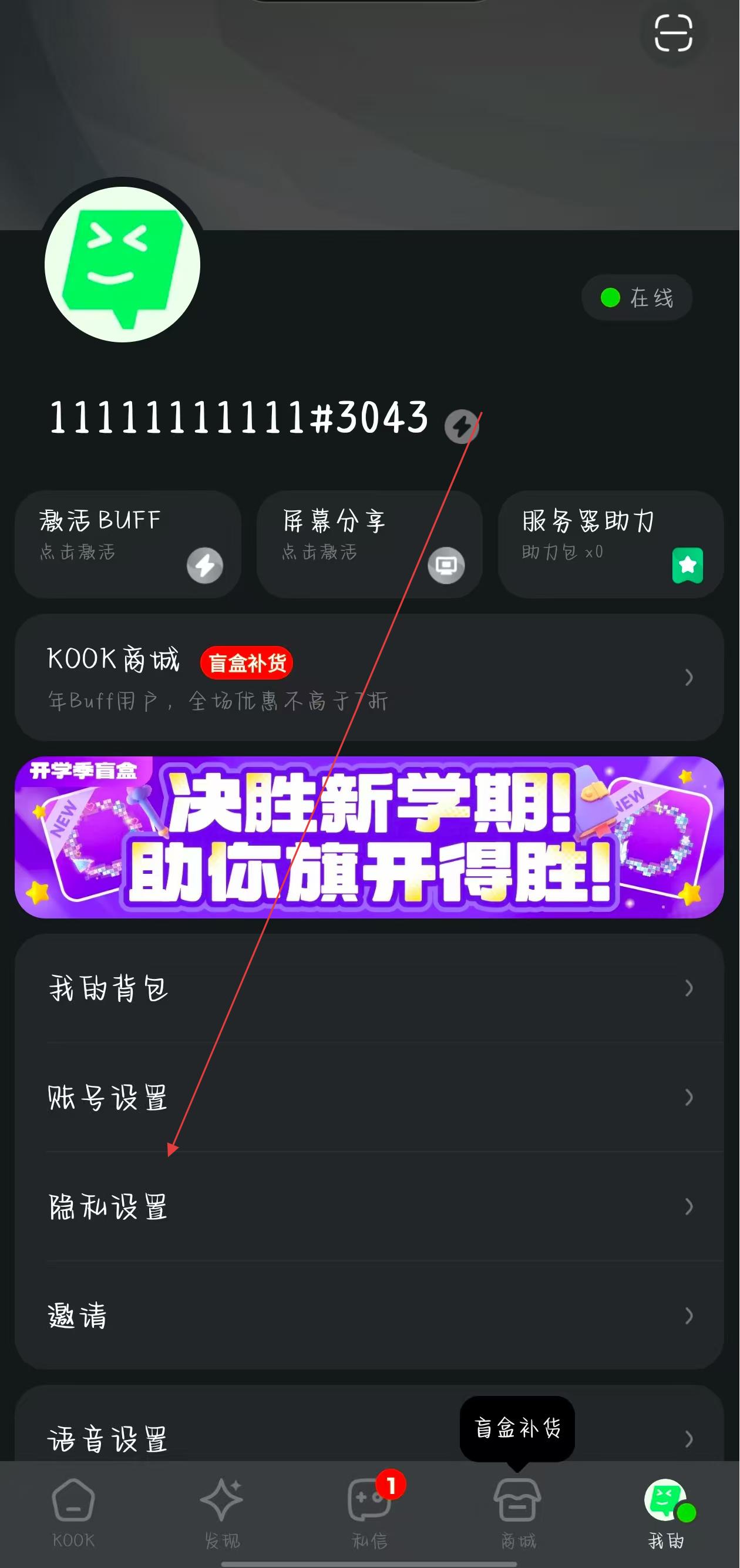1、打開KOOKAPP,進入我的頁面,點擊隱私設置選項。