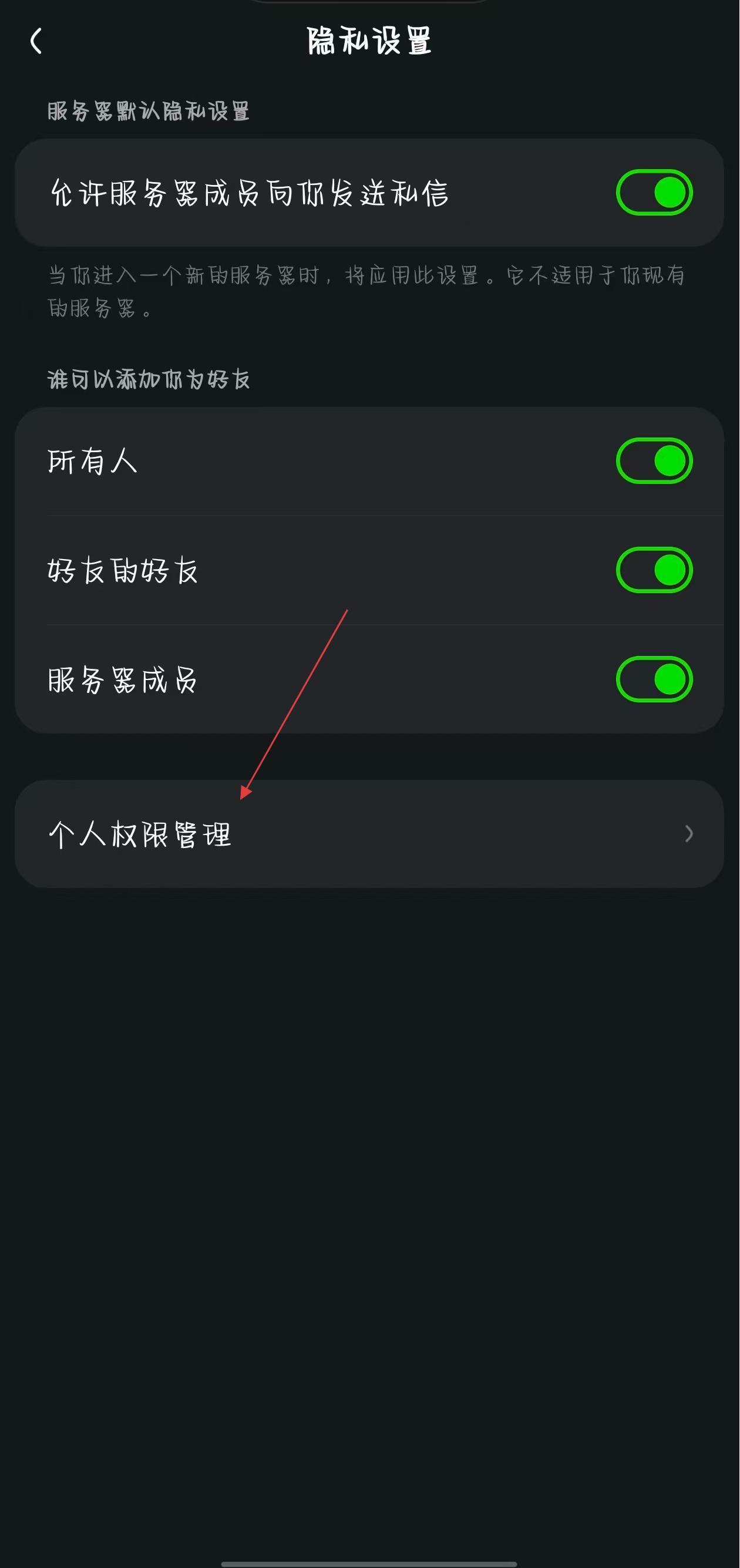 2、在隱私設置頁面,點擊個人權限管理選項。