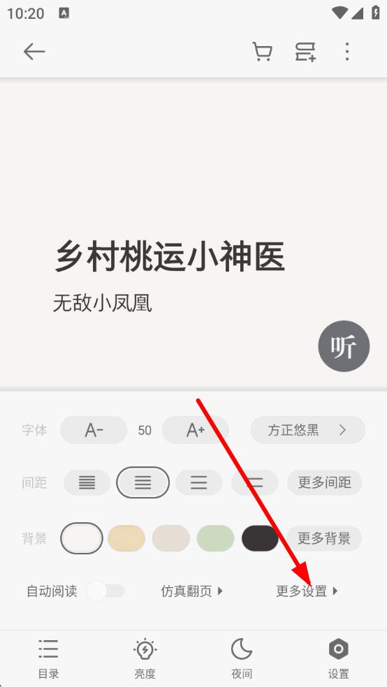 2、在設(shè)置菜單里,點(diǎn)擊更多設(shè)置選項(xiàng)進(jìn)入更詳細(xì)的閱讀設(shè)置頁面。