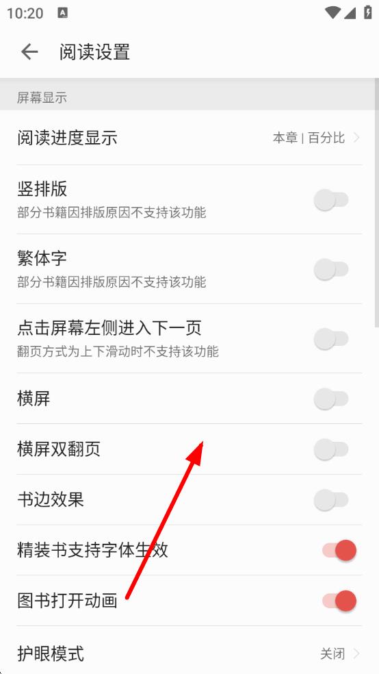 3、在閱讀設(shè)置頁面中,找到橫屏選項(xiàng),點(diǎn)擊開啟該選項(xiàng)即可旋轉(zhuǎn)屏幕進(jìn)行橫屏閱讀。