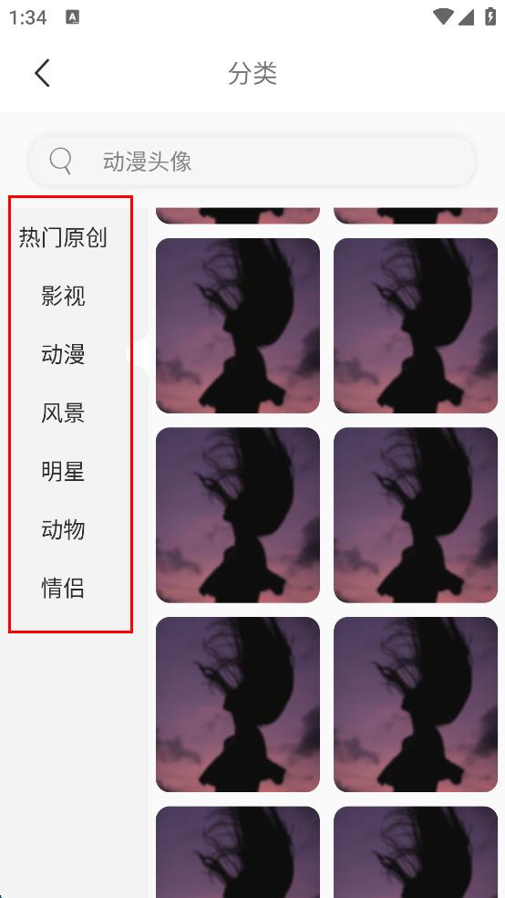3、在分類頁面,左側(cè)有熱門原創(chuàng)、影視、動漫等多個分類,選擇自己感興趣的分類,點擊進(jìn)入該分類下的壁紙展示頁面。