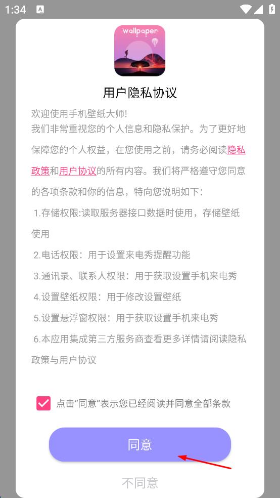 1、打開手機(jī)壁紙大師,彈出用戶隱私協(xié)議彈窗,勾選“點擊‘同意’表示您已經(jīng)閱讀并同意全部條款”,點擊“同意”按鈕,進(jìn)入軟件主界面。