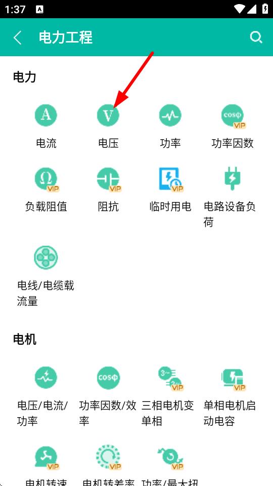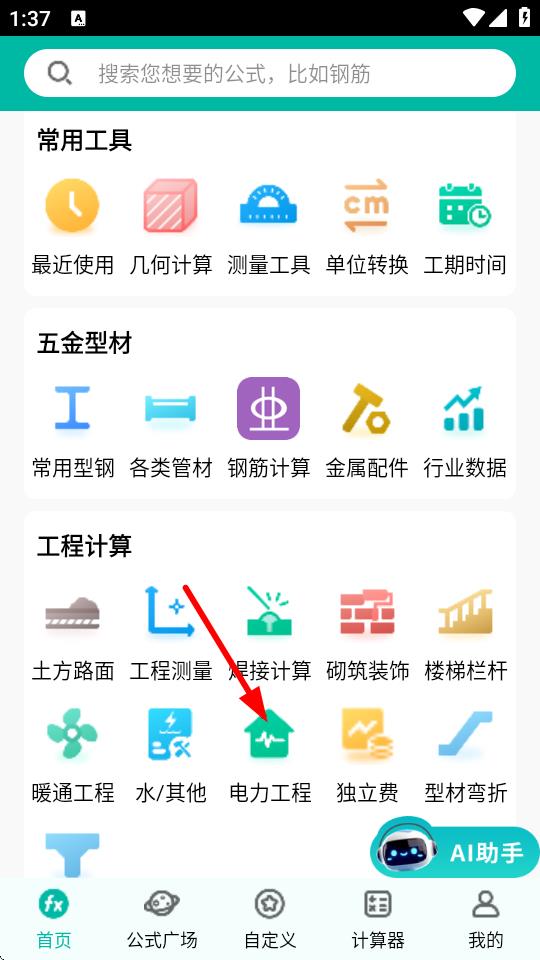 2、在首頁的工程計算板塊里,找到并點擊電力工程選項。