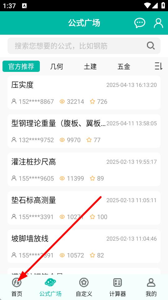 1、打開建工計算器應用,點擊底部導航欄中的首頁選項。