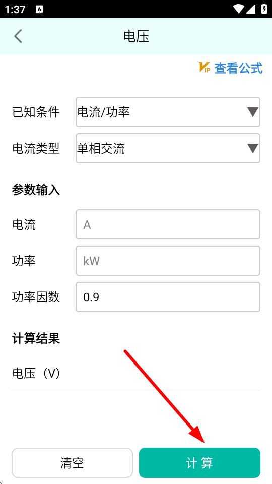 4、點擊進入相應計算頁面,根據(jù)頁面提示,選擇已知條件、電流類型等,在參數(shù)輸入框中輸入電流、功率、功率因數(shù)等相關參數(shù)。
