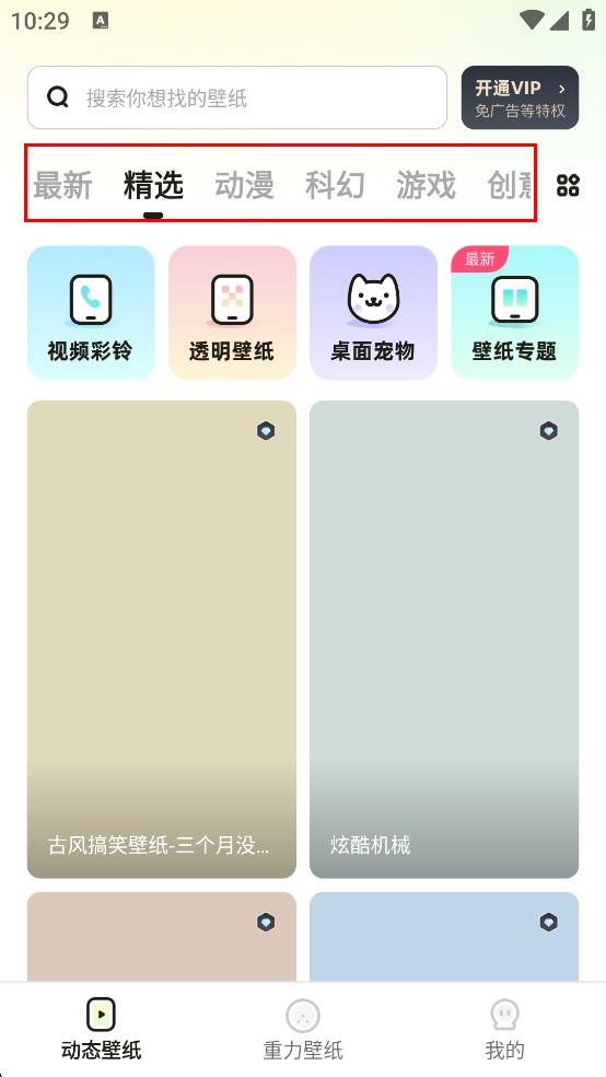 1、打開壁紙軟件,在頂部的分類標簽里,能看到多個不同標簽,進入自己心儀的壁紙的展示頁面。
