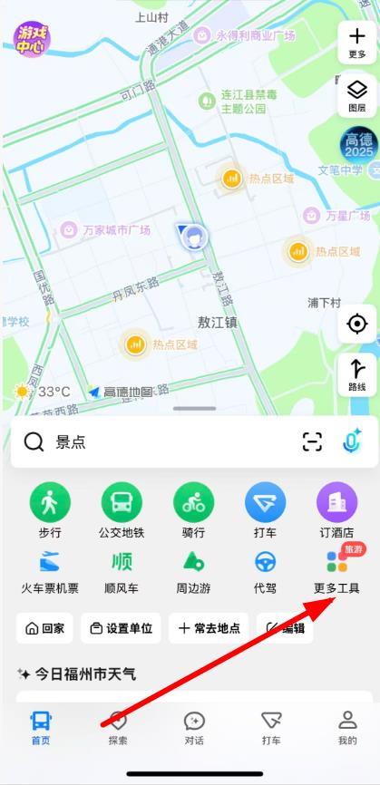 1、打開高德地圖APP,在首頁點(diǎn)擊更多工具選項(xiàng)。