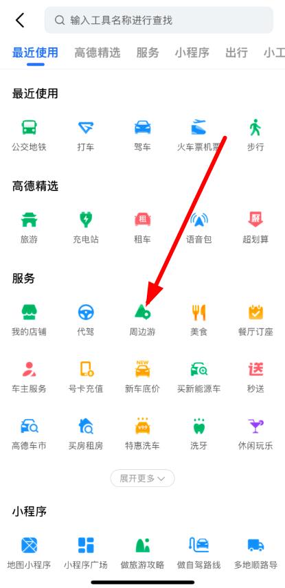 2、在更多工具頁面的服務(wù)板塊中,找到并點(diǎn)擊周邊游。