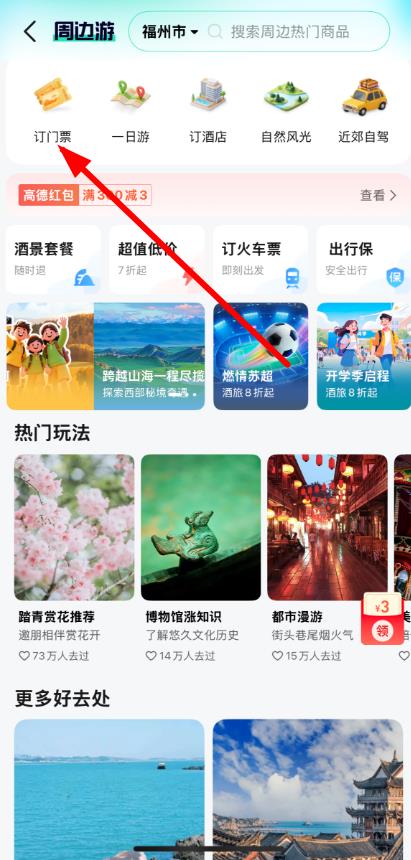 3、進(jìn)入周邊游頁面后,點(diǎn)擊訂門票選項(xiàng),然后根據(jù)提示選擇想要預(yù)訂門票的景點(diǎn)并完成訂票操作。