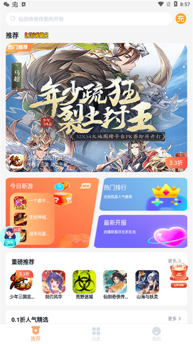 折扣充是一款十分好用的生活服務(wù)類軟件,是一個專門為了用戶進行下載游戲的軟件,為用戶提供了許許多多豐富的游戲類型,讓用戶可以隨時滿足自己的下載需求,各種折扣的福利卡也去領(lǐng)取,不同的板塊內(nèi)容有著不同的游戲分類,游戲預約來領(lǐng)取新手的好禮,折扣福利能享個不停。