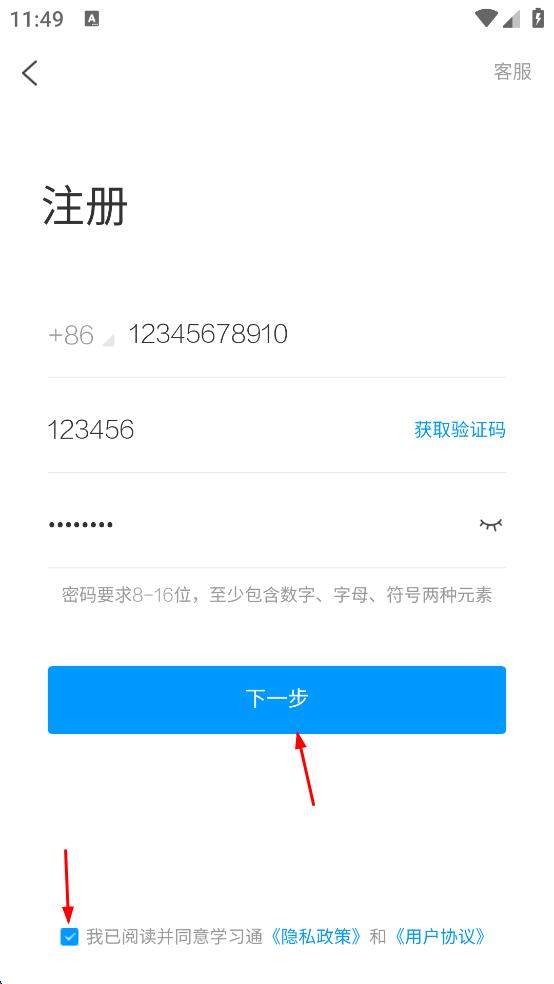 4、勾選我已閱讀并同意學(xué)習(xí)通隱私政策和用戶協(xié)議,然后點(diǎn)擊下一步按鈕。