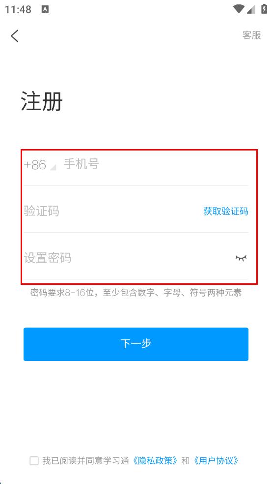3、在注冊頁面,依次填寫手機(jī)號、獲取并填寫驗(yàn)證碼,再設(shè)置符合要求的密碼。