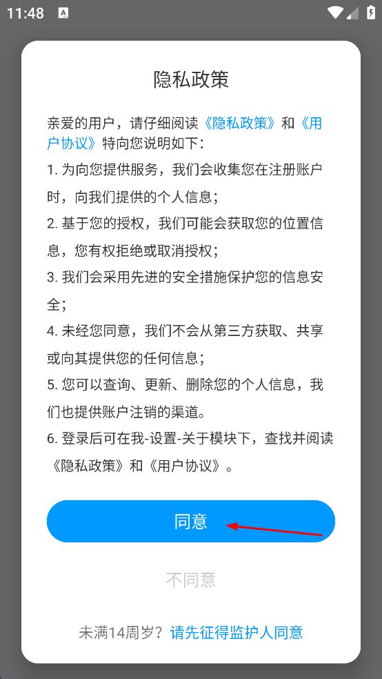 1、打開學(xué)習(xí)通,會彈出隱私政策頁面,仔細(xì)閱讀后點(diǎn)擊同意按鈕。