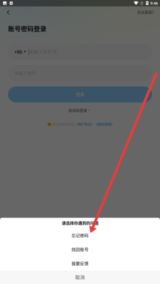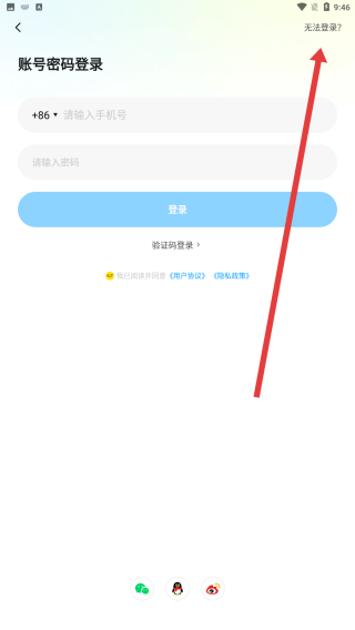 1、在登錄頁(yè)面中,若忘記密碼了可以點(diǎn)擊右上角的無(wú)法登陸按鈕。