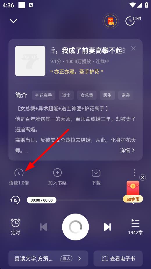 3、在聽書播放界面,找到語速1.0倍按鈕,點擊該按鈕,根據(jù)個人喜好選擇合適的語速,如0.5倍、1.2倍、1.5倍等,調(diào)整聽書的播放速度。