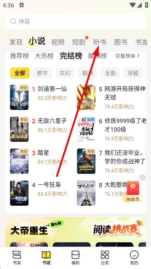 1、打開七貓小說APP,進入書城界面,點擊上方的聽書選項,進入聽書頁面,這里有各類聽書資源。