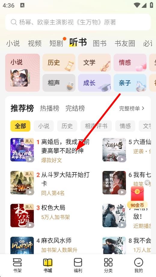 2、在聽書頁面中,選擇想聽的小說,比如任意一本在推薦榜中的小說,點擊進入聽書播放界面。