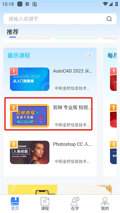 1、打開軟件之后,我們就可以看到非常多熱門的課程,都是針對我們不同技能的課程,我們可以學(xué)習(xí)感興趣的內(nèi)容;