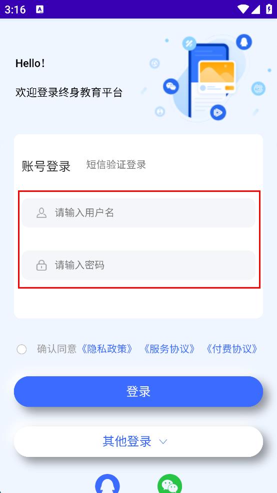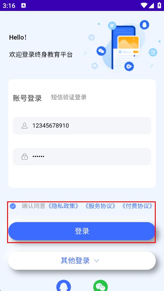 4、確認(rèn)用戶名和密碼輸入無誤,且勾選確認(rèn)同意隱私政策,服務(wù)協(xié)議,付費(fèi)協(xié)議后,點擊登錄按鈕,即可完成終身教育平臺APP的登錄操作。