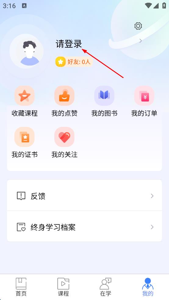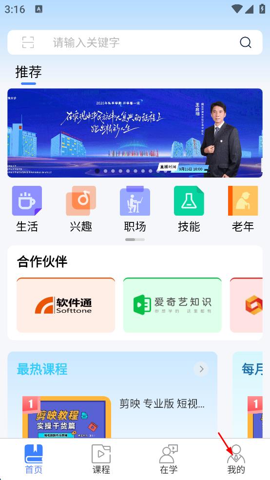 1、打開終身教育平臺APP,進(jìn)入首頁后,能看到各類課程分類和推薦內(nèi)容,點擊頁面右下角“我的”選項,進(jìn)入個人中心頁面。