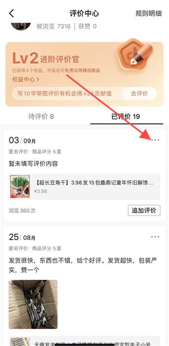 3、在跳轉(zhuǎn)頁面之后,切換到【已評價】頁面,可以看到之前的所有評價內(nèi)容,找到評價后方的按鈕;