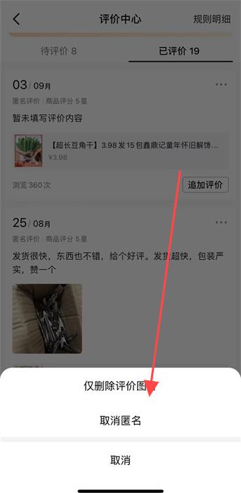 4、最后,點擊按鈕會彈出彈窗,可以選擇取消匿名或者刪除評價圖片,整個過程非常的簡單。