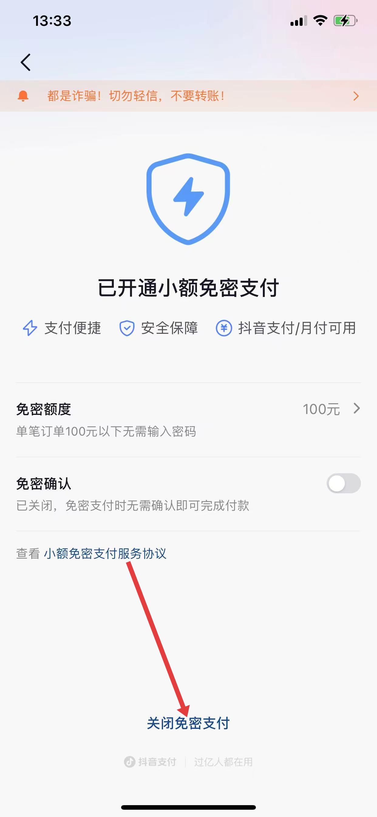 4、拉到頁面底部,點擊關(guān)閉免密支付,即可關(guān)閉。