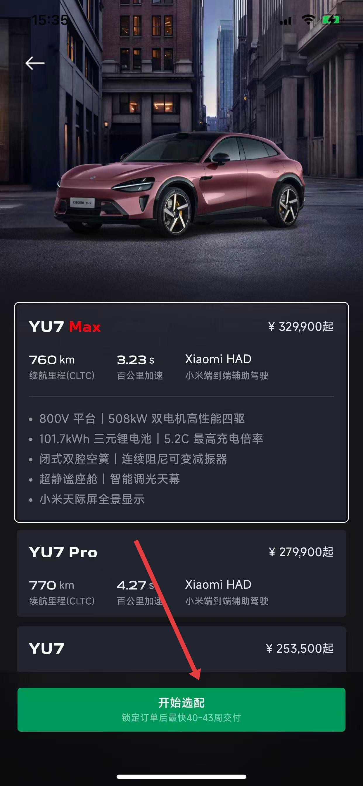 2、在車型選擇頁(yè)面,瀏覽在售的小米汽車版本,比如YU7系列的不同配置車型,點(diǎn)擊開(kāi)始選配。