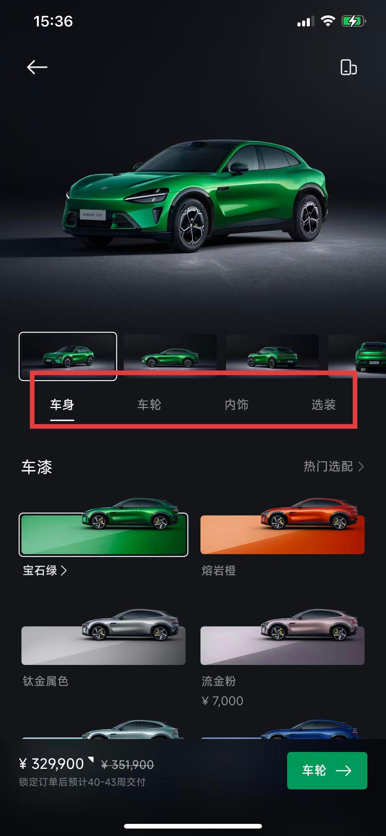 3、進(jìn)入車輛選配界面,根據(jù)個(gè)人喜好對(duì)車身顏色、車輪樣式、內(nèi)飾風(fēng)格以及其他可選裝項(xiàng)目進(jìn)行選擇,完成車輛配置。