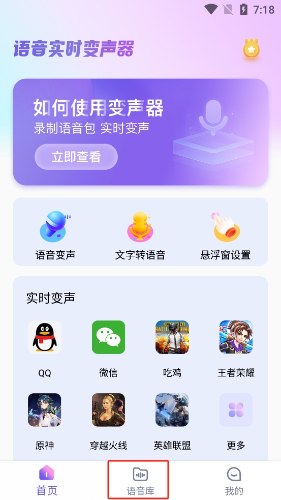 1、進(jìn)入軟件后將會(huì)看到各種變聲器功能使用,我們選擇語(yǔ)音庫(kù);