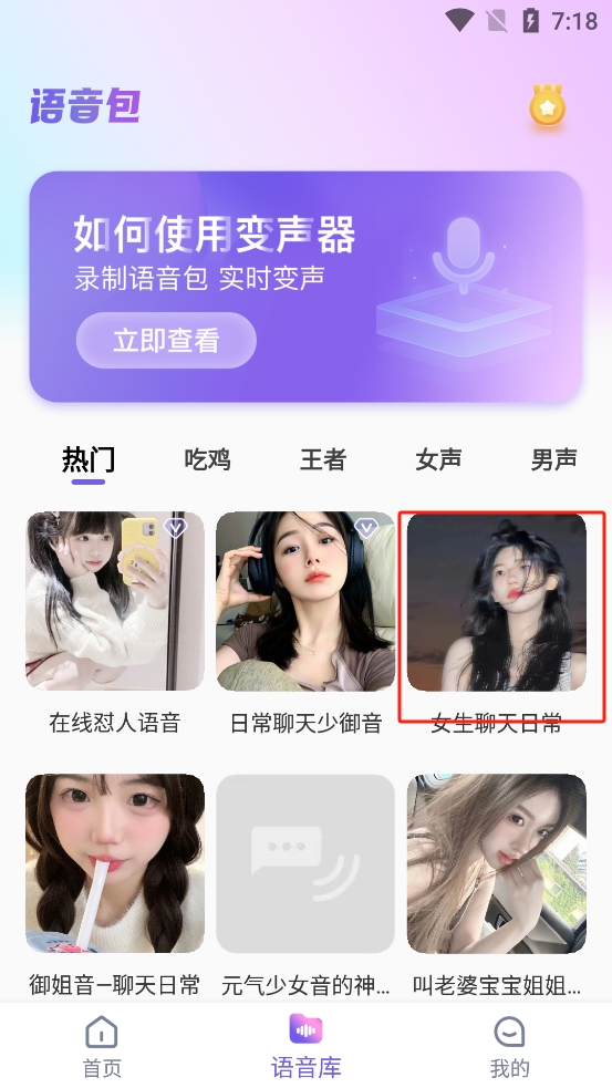 2、進(jìn)入語(yǔ)音庫(kù)中將會(huì)看到各種不同的語(yǔ)音選擇,我們以女生聊天日常語(yǔ)音包為例;