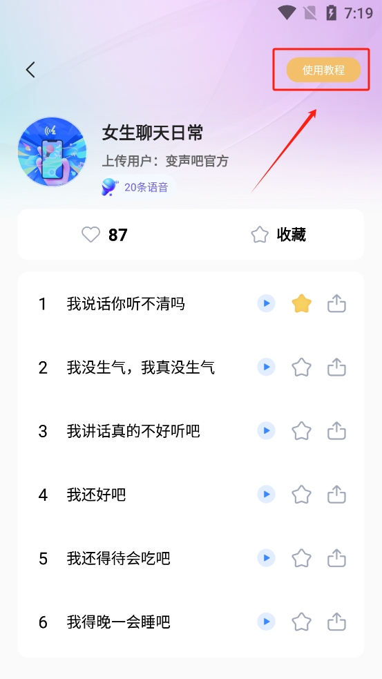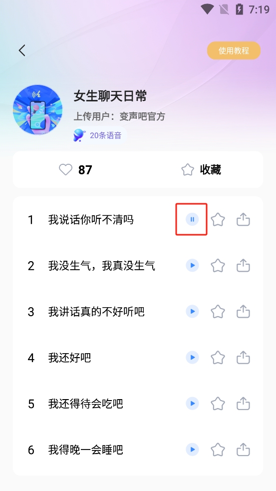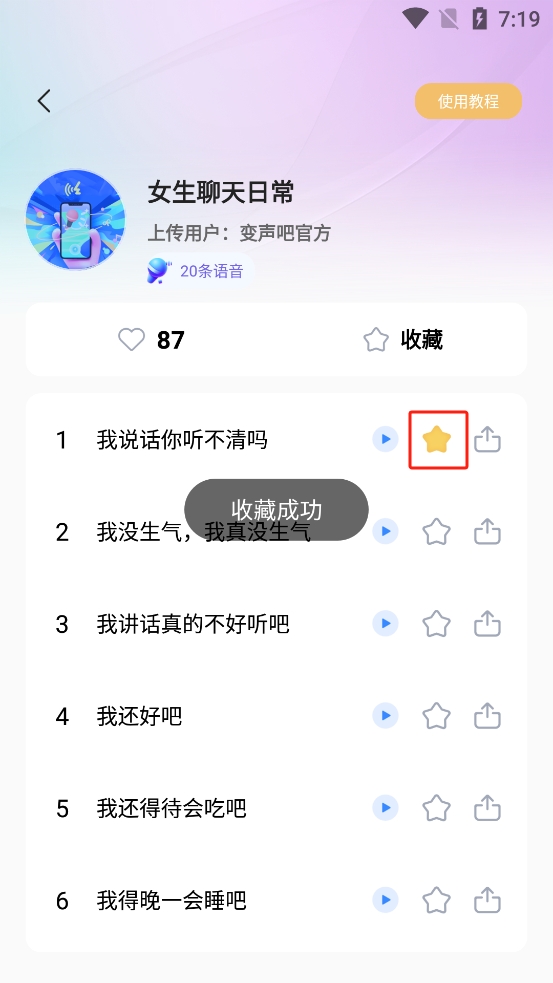 4、遇到需要經(jīng)常使用的語(yǔ)音可以通過(guò)收藏保存下來(lái),隨時(shí)可以更加快速得找到語(yǔ)音包進(jìn)行發(fā)送;